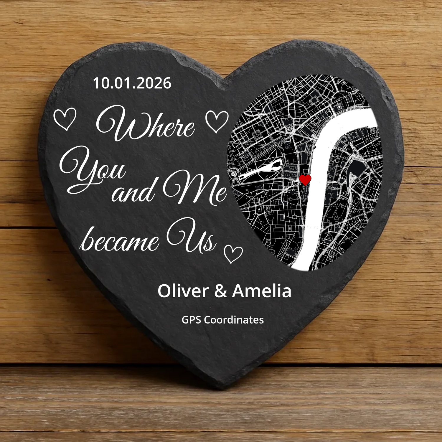 Turn your heart's coordinates into a work of art on natural slate. An exclusive detail that tells your story.